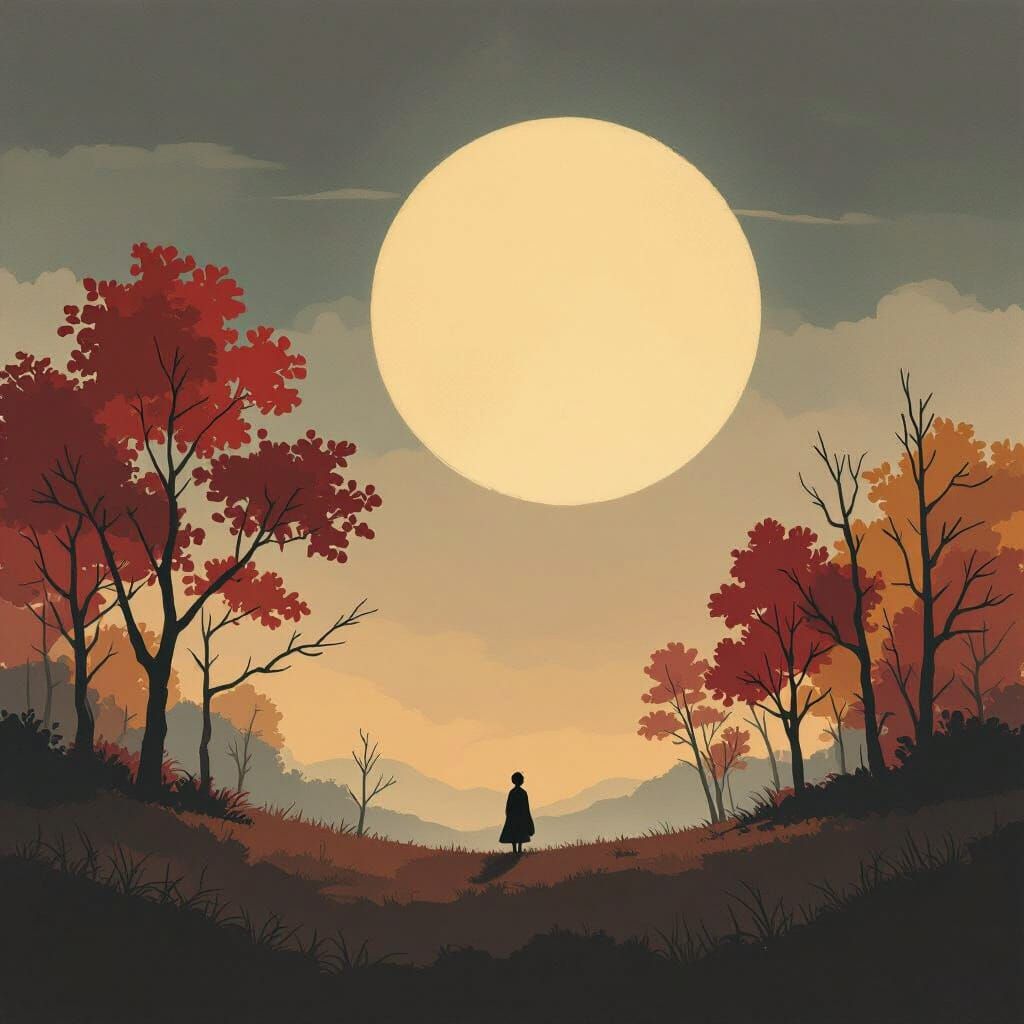 This image depicts a dreamlike autumn scene at twilight. A solitary figure is silhouetted against a large, glowing moon, set within a muted, atmospheric color palette.
