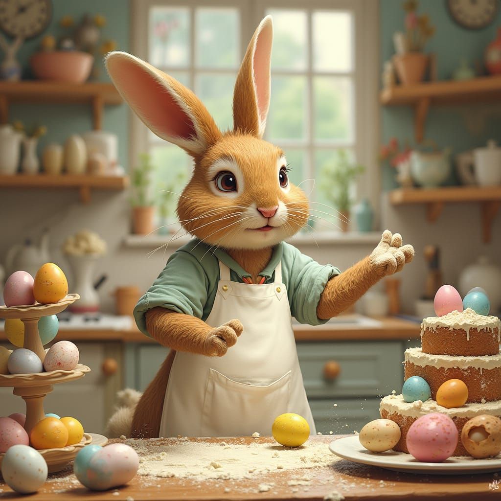 Easter bunny, busy bunny wife, holiday rush in the kitchen background, cakes, eggs, a scene of chaos.