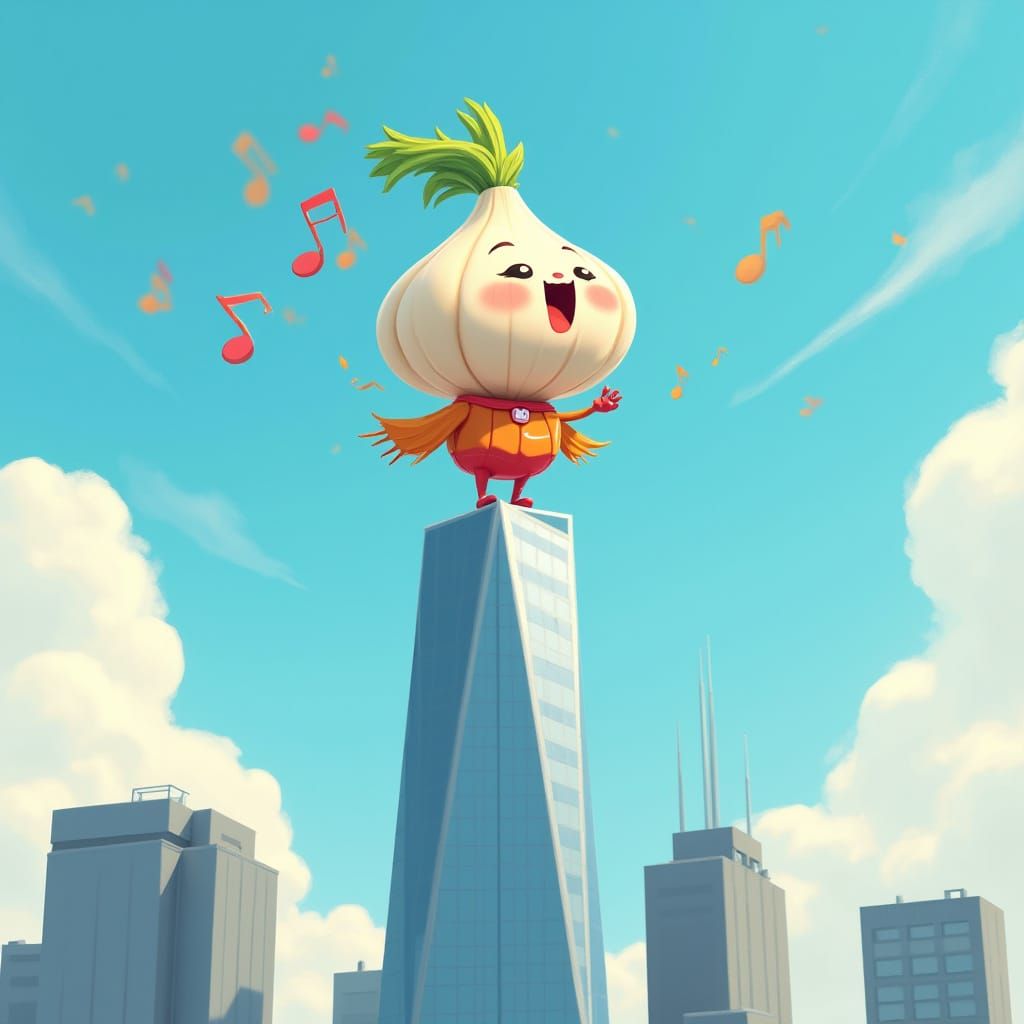A whimsical garlic character sings atop a skyscraper against a bright blue sky. The artwork has a dreamlike quality and is reminiscent of modern concept art.
