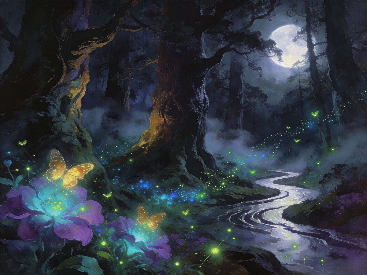This image shows an epic digital matte painting of a dark, enchanted forest at night. A river reflects moonlight, while bioluminescent flora and glowing insects create an ethereal glow. Rendered with dramatic lighting and maximalist detail.