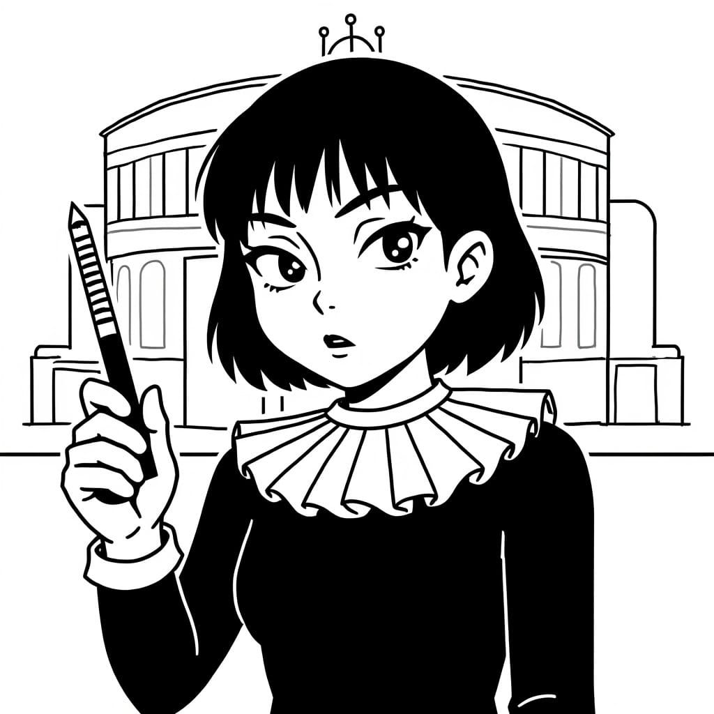 A cartoon of Padme Amidala in Renaissance attire holding a quill. Stylized to resemble Samurai Jack and Al Hirschfeld, it features bold lines and exaggerated features against the Globe Theatre.