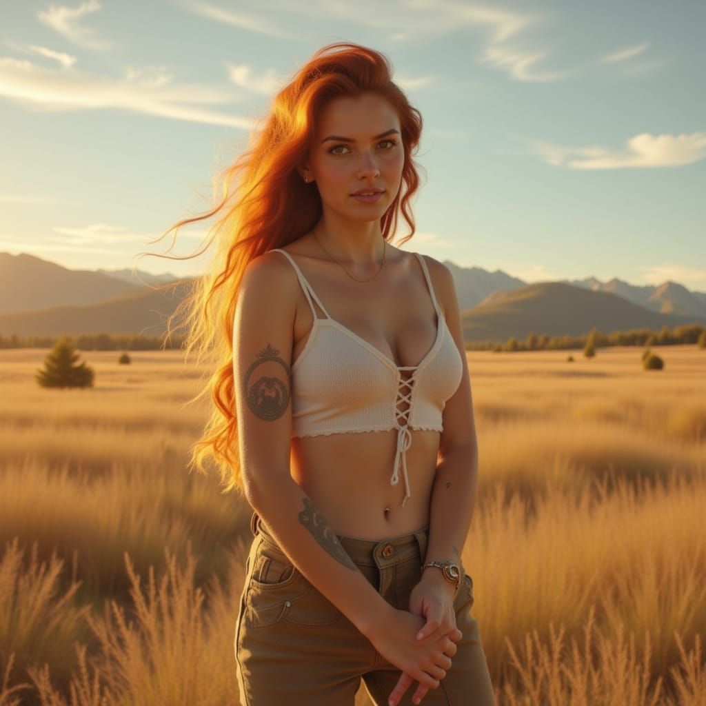 This image shows a striking woman with long red hair, standing in a prairie. The artwork features neutral colors and a photorealistic aesthetic.