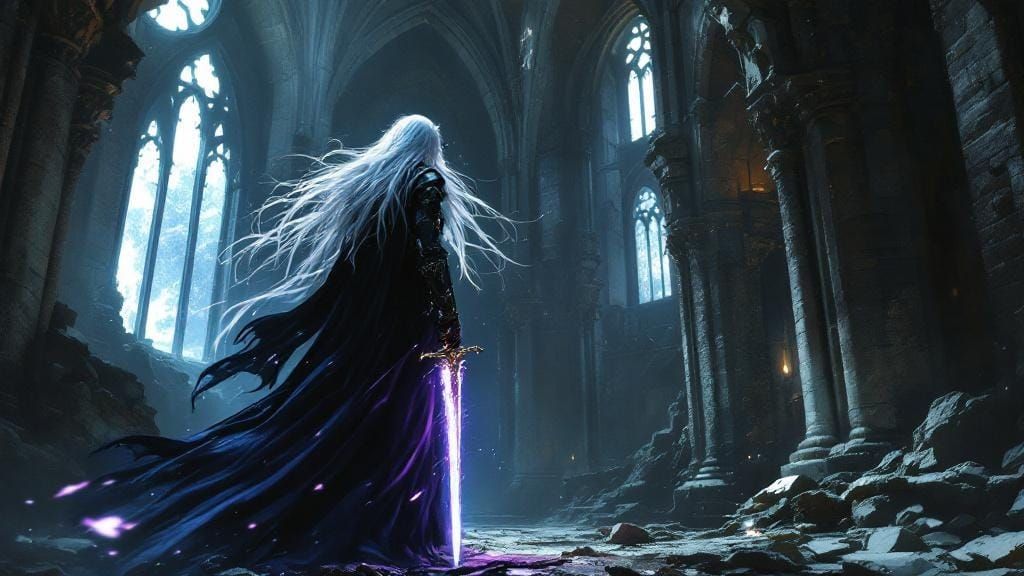 This image shows an elven knight in gothic armor standing amidst the ruins of a cathedral, a glowing sword held in their hand. The piece is a digital painting in a dark fantasy style with dynamic lighting.