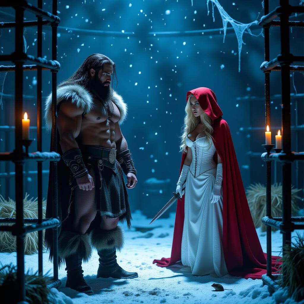 A dramatic scene of a muscular man in an animal cage as a blonde woman breaks in. The image features dramatic lighting, industrial textures, and a muted color palette.
