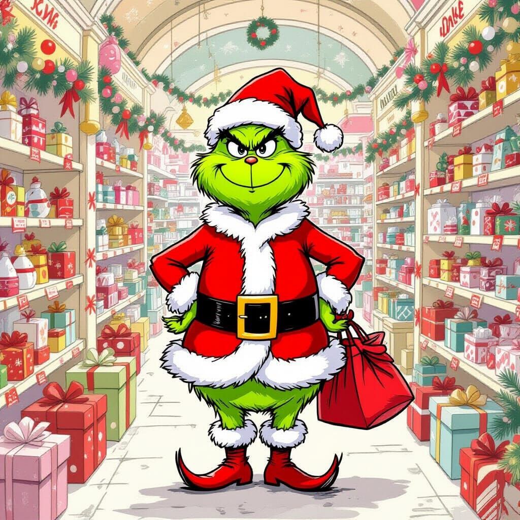 A festive image of the Grinch in a Santa suit shopping in a Christmas store. This artwork blends whimsical and nostalgic illustration styles with soft pastel colours.