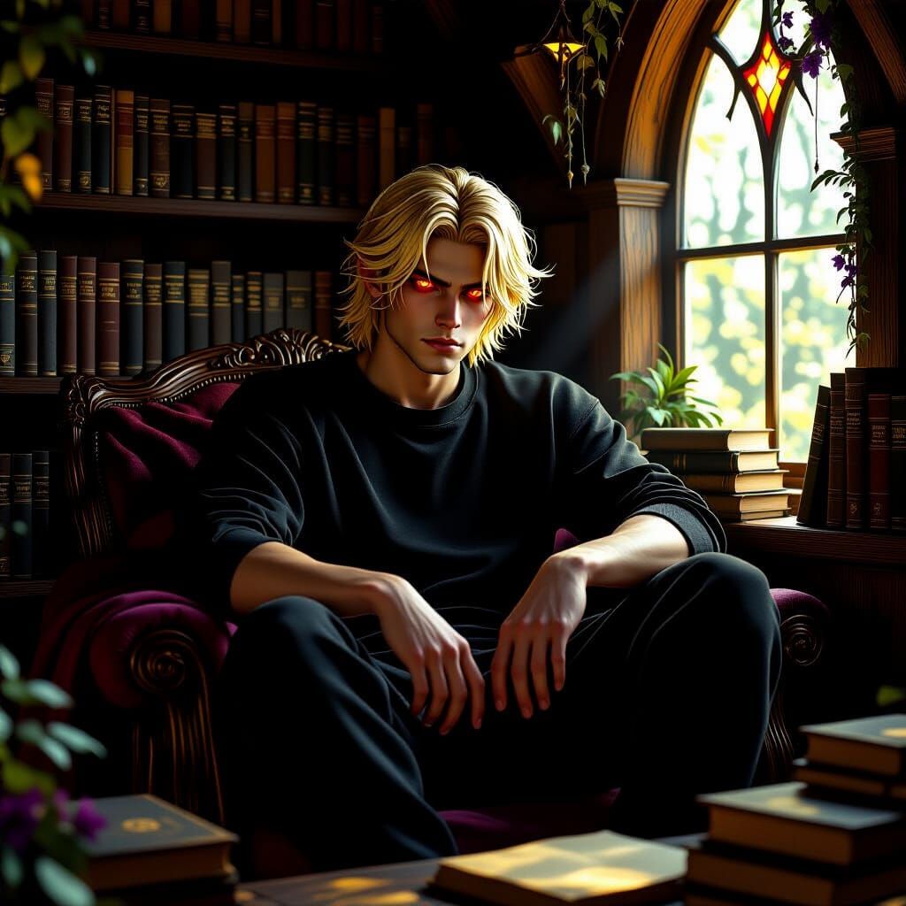 A young man with blond hair and red eyes sits in a dimly lit forest cottage, engrossed in history books. The scene features a dark fantasy setting with volumetric lighting and intricate details, rendered in a style combining art nouveau and detailed fantasy art.