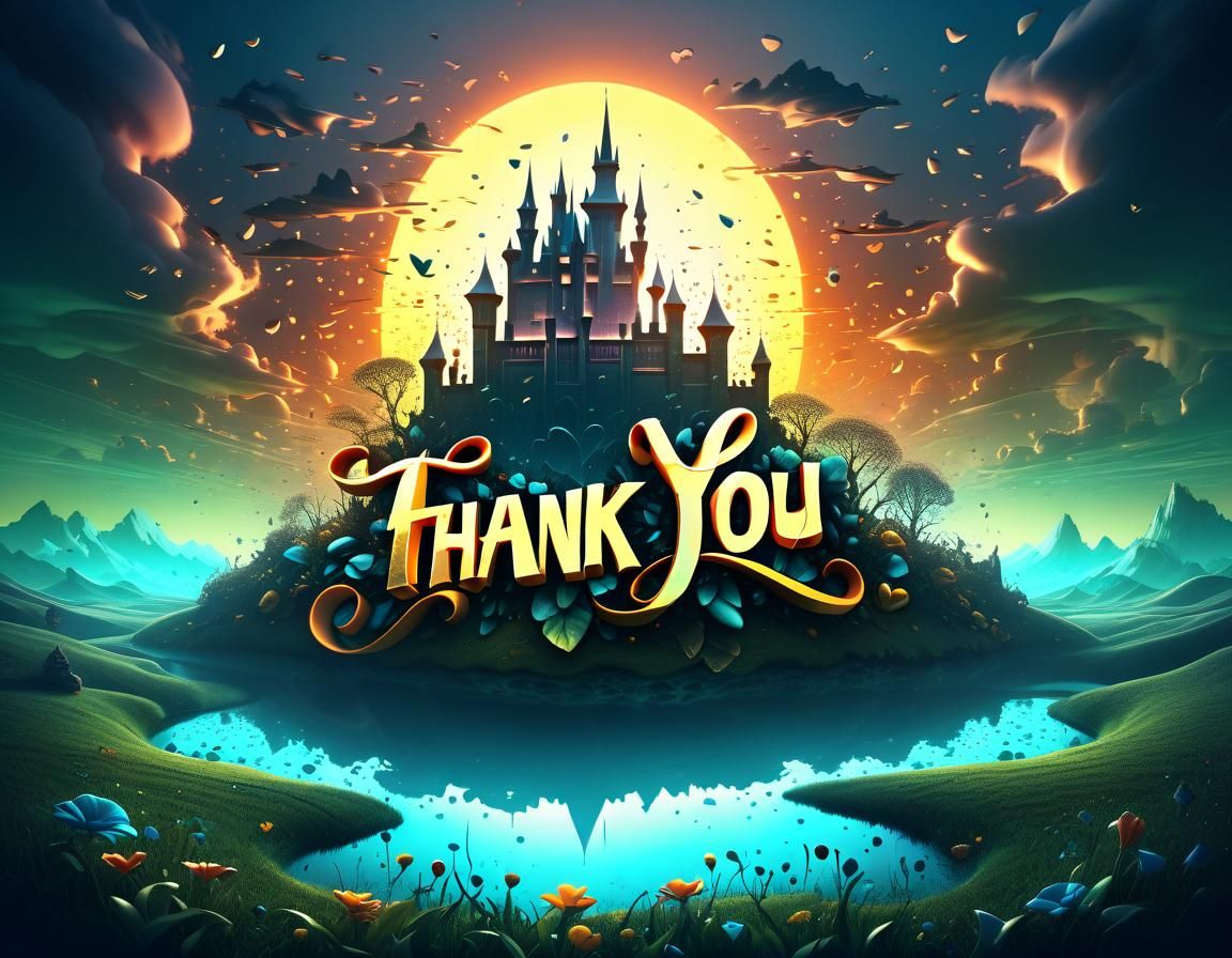 A striking picture of a lush fantasy landscape with a distant castle at sunrise. The words 'THANK YOU' are displayed in huge lettering as 3D rendered digital art.