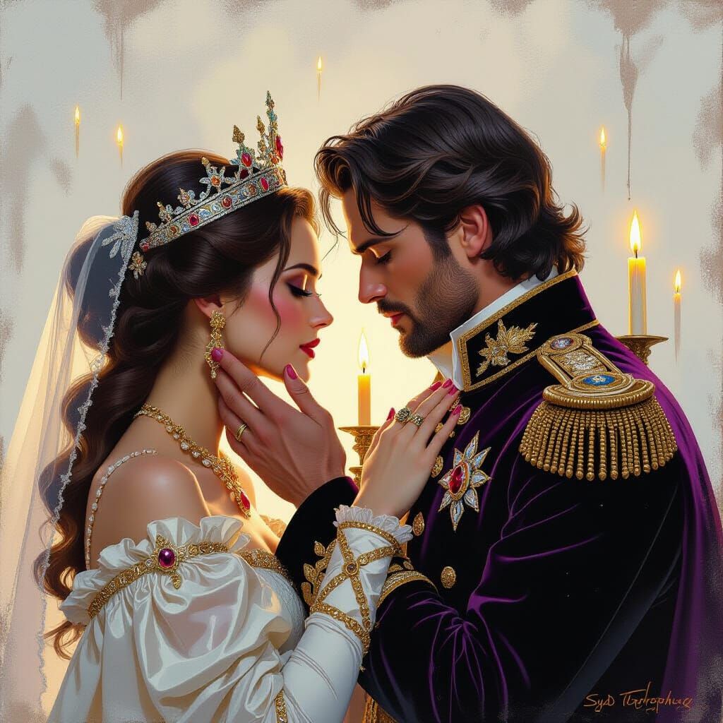 This image shows a queen tenderly holding her king's face, their eyes glowing in dim candlelight. Created with airbrushed acrylics, it features atmospheric lighting and vibrant colors.