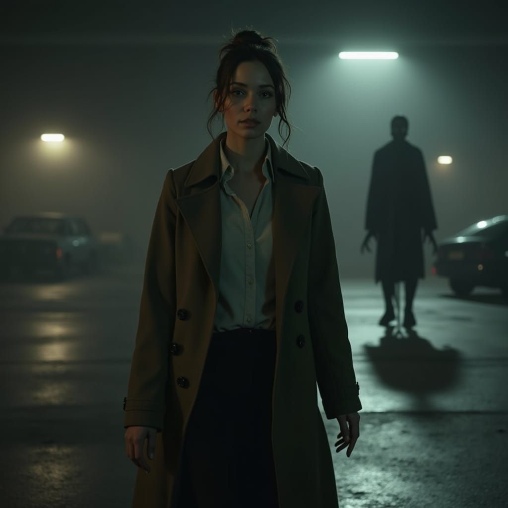 This image shows Linda Lewis, a stylish woman in her forties, unknowingly stalked by a Nosferatu in a dimly lit parking lot. The scene is rendered with intricate textures and cinematic lighting, in a hyper-realistic style.