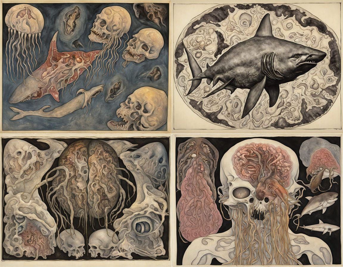 This image depicts a disturbing hybrid creature with jellyfish and shark elements, evoking themes of vivisection. The artwork blends cubist and icon painting techniques.