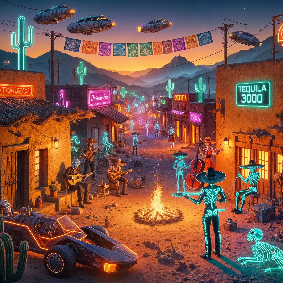 This image shows a Mexican desert village blending futuristic and traditional themes. Cybernetic musicians play under holographic skulls as residents celebrate with a robotic bull, all in a vibrant cyberpunk style.