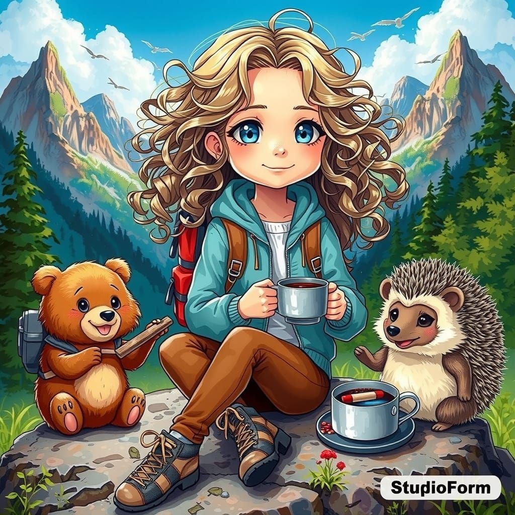 This image shows a young girl with curly hair sitting on a rock in a mountainous landscape. Nearby, a bear and hedgehog are preparing food in a vibrant anime style with cel-shaded textures.