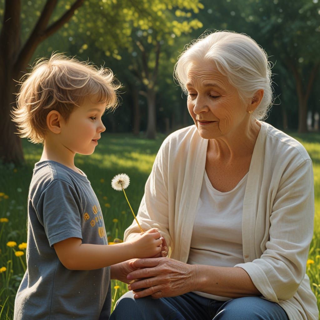 This expressive oil painting captures a tender moment of a child offering a dandelion to an elder in a softly lit park at golden hour, featuring visible impasto brushstrokes.