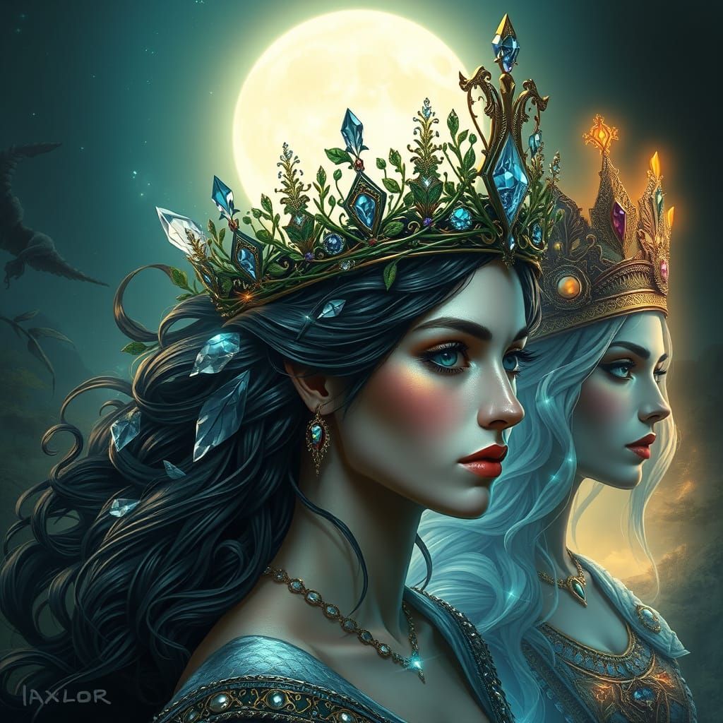 This image showcases majestic crystal crowns, elegant leaf tiaras, and intricate royal portraits. Featuring precious gems and futuristic designs, rendered in a luminous fantasy art style.