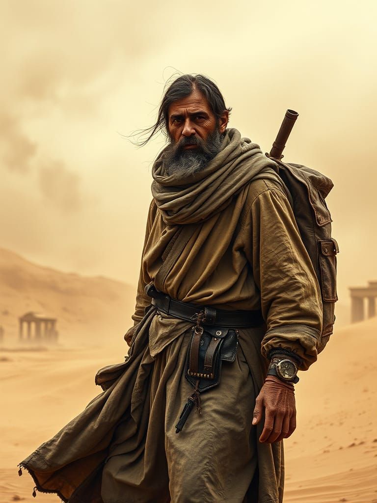 A lone desert traveler from the 1820s stands firm in a sandstorm. Wearing earth-toned robes and a leather satchel, ruins can be seen in the distance. Cinematic realism with hyper-detailed textures.