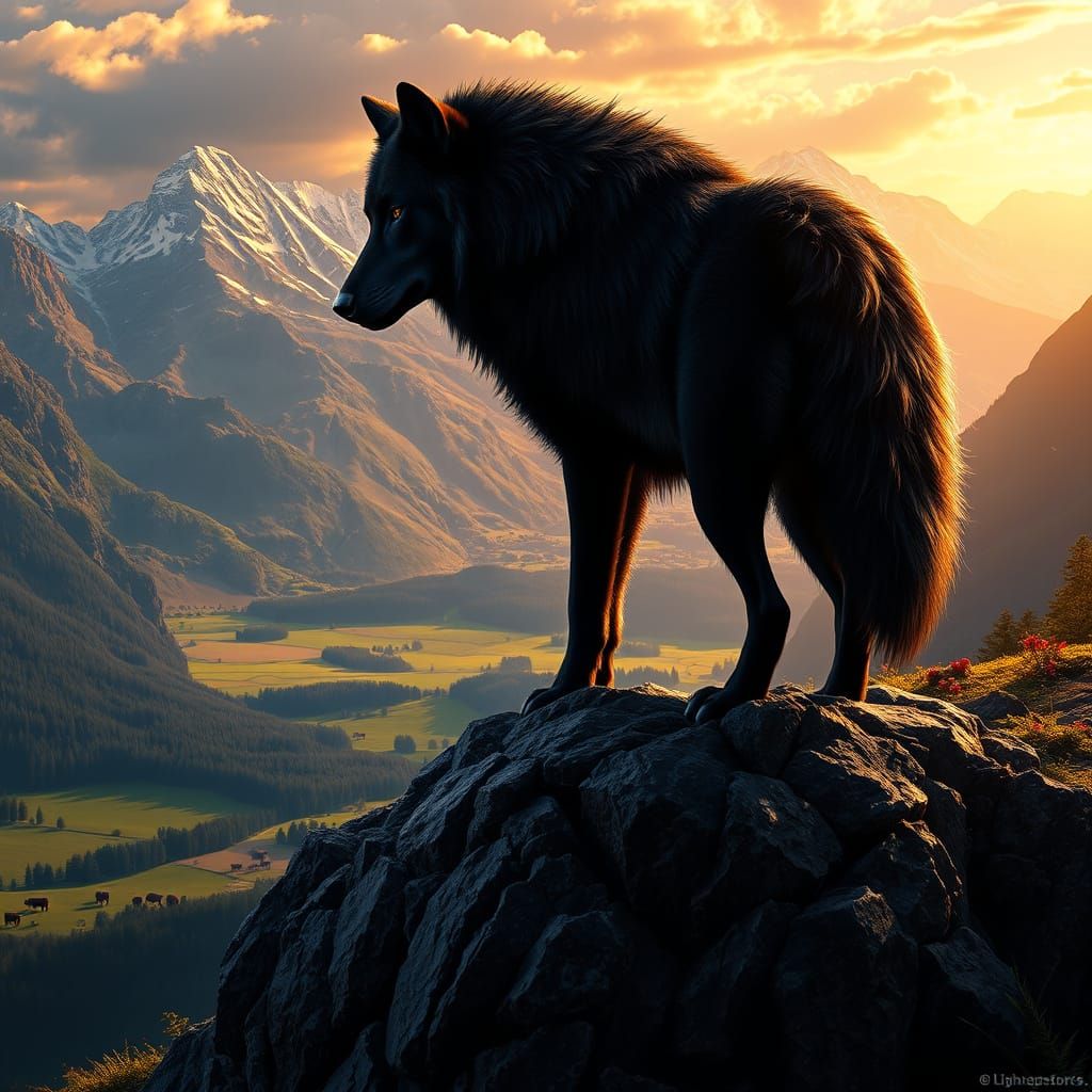This image depicts a majestic black wolf on a rocky ridge, overlooking a vibrant green valley with cows. The Swiss Alps are visible in the background, illuminated by warm sunlight. Rendered in a hyperrealistic concept art style with intricate detail and dramatic lighting.
