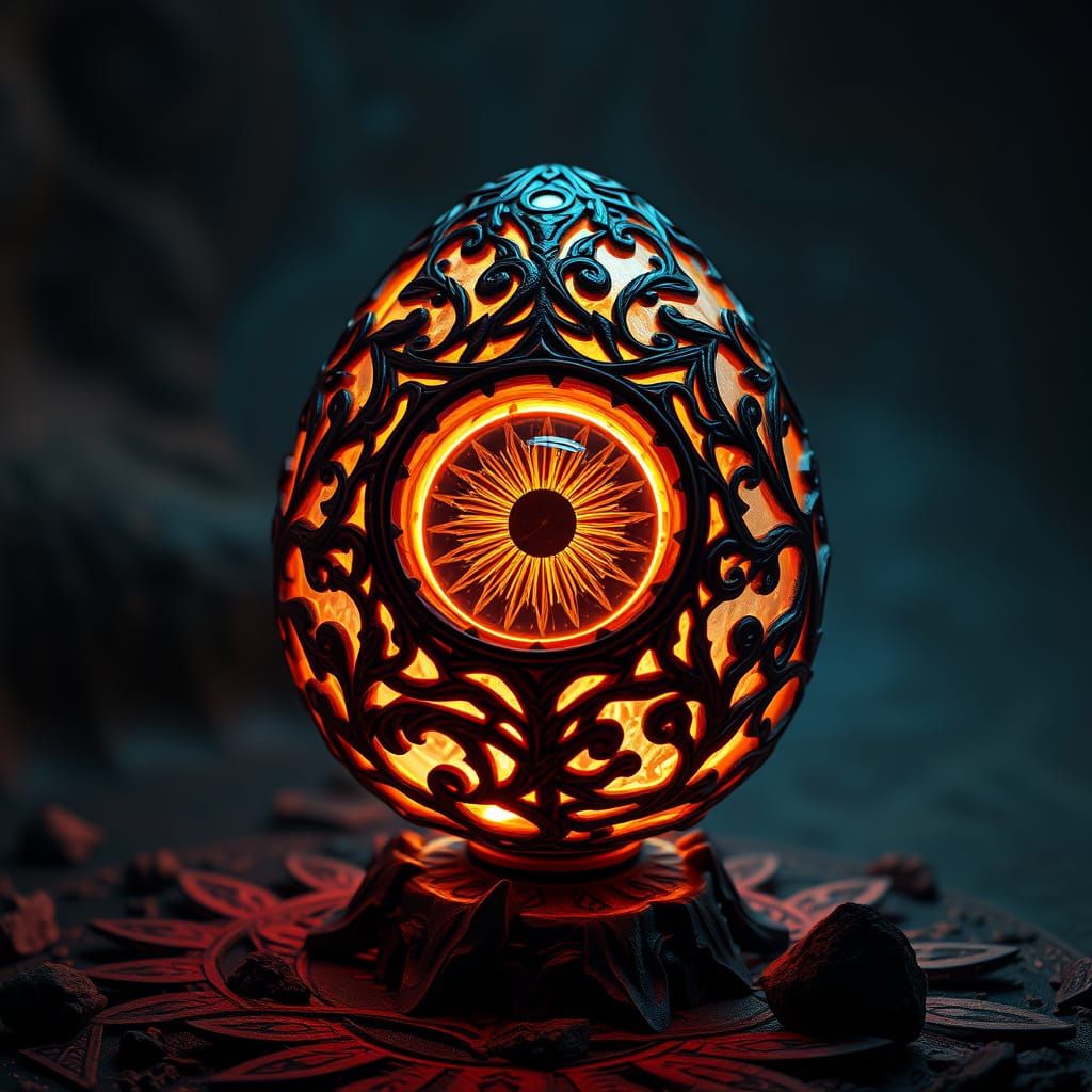 A glowing, intricately carved egg-shaped eye radiates an otherworldly aura, surrounded by dark mystique and eerie horror elements, reminiscent of bioluminescent creatures and mystical symbolism, with a rich, reddish-brown color palette and masterful composition adhering to the golden ratio.