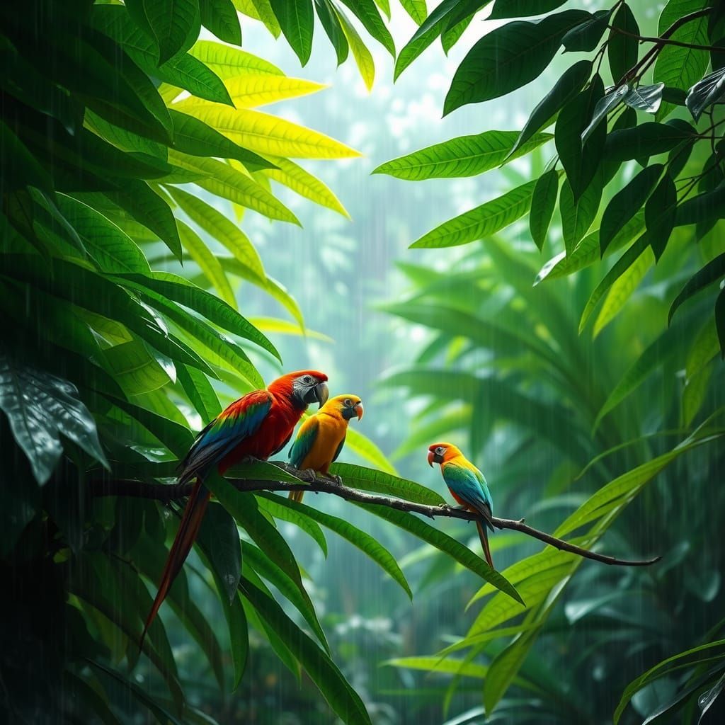 A vibrant, photorealistic image captures a rainforest canopy during a downpour. Exotic birds with colorful plumage seek shelter under glistening, broad leaves in the humid air.