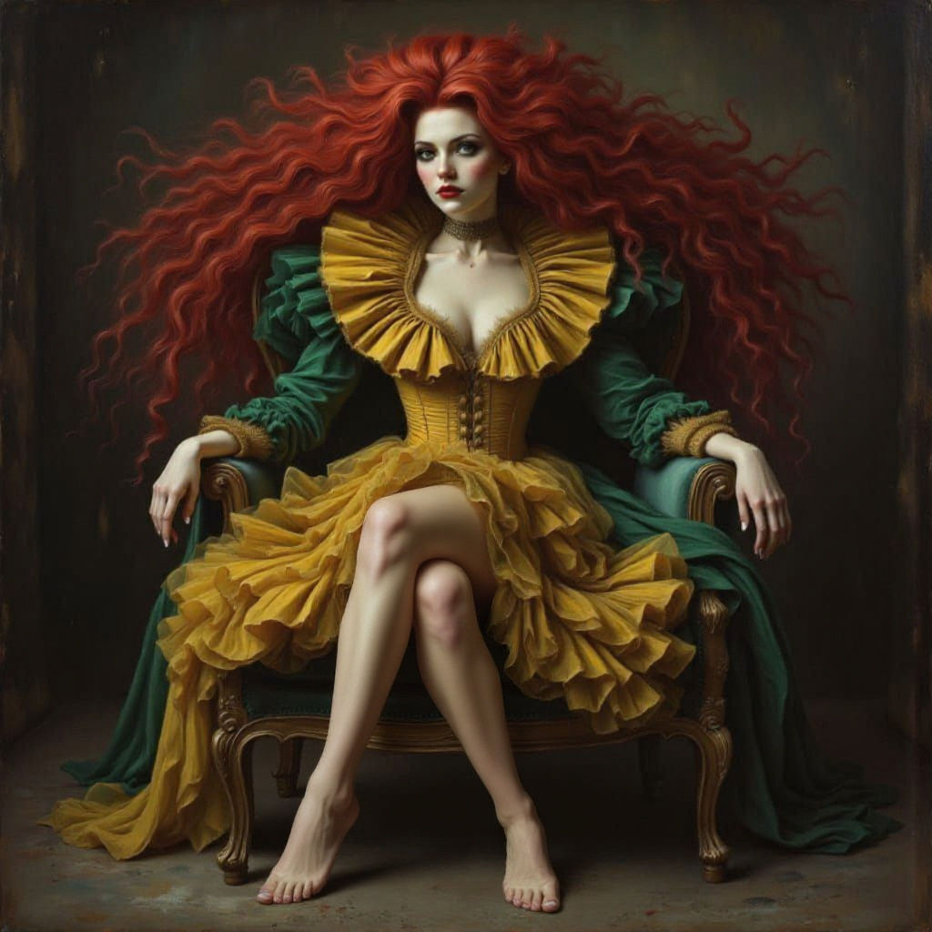 A striking oil painting captures a woman with wild red hair, seated regally in an ornate armchair. She wears a dramatic yellow ruffled dress and green velvet jacket, set against a moody background.