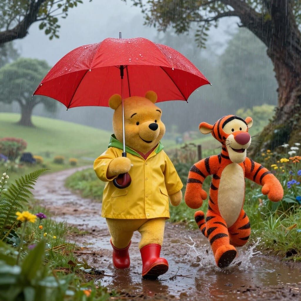 This image shows Christopher Robin, Pooh Bear, and Tigger joyfully navigating a rainy path in the Hundred Acre Wood. Captured in a nostalgic Disney and E.H. Shepard style with warm, realistic textures and soft lighting.