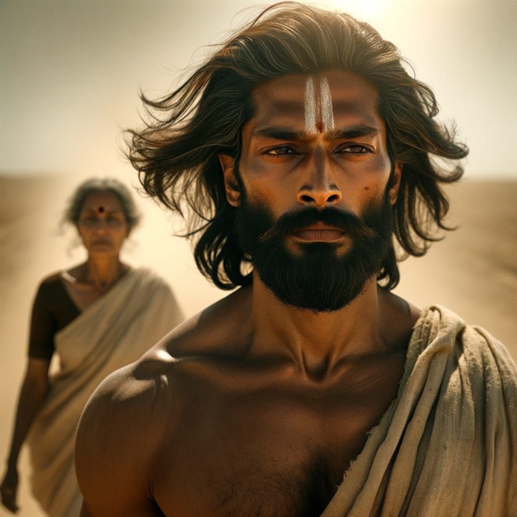 This image shows a traditional Indian family walking on a dusty road in bright sunlight. A man leads the way, radiating strength, followed by a woman with a tired expression.