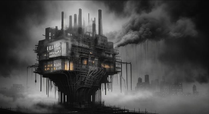 A high-contrast, black and white mural with neon accents depicts industrialization's impact on art value. Features intricate lines, gritty textures, and smoke-filled atmosphere in a dramatic, cinematic style.