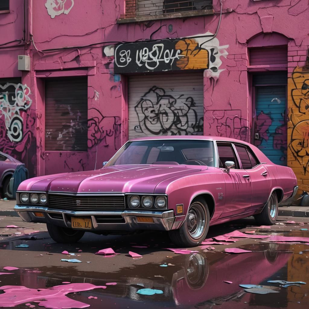 A vibrant, high-contrast image of a 1969 Buick sedan, painted in intricate detail with a focus on metallic pink hues and graffiti art, showcasing the artist's use of oil gouache and acrylic techniques in a digital masterpiece.