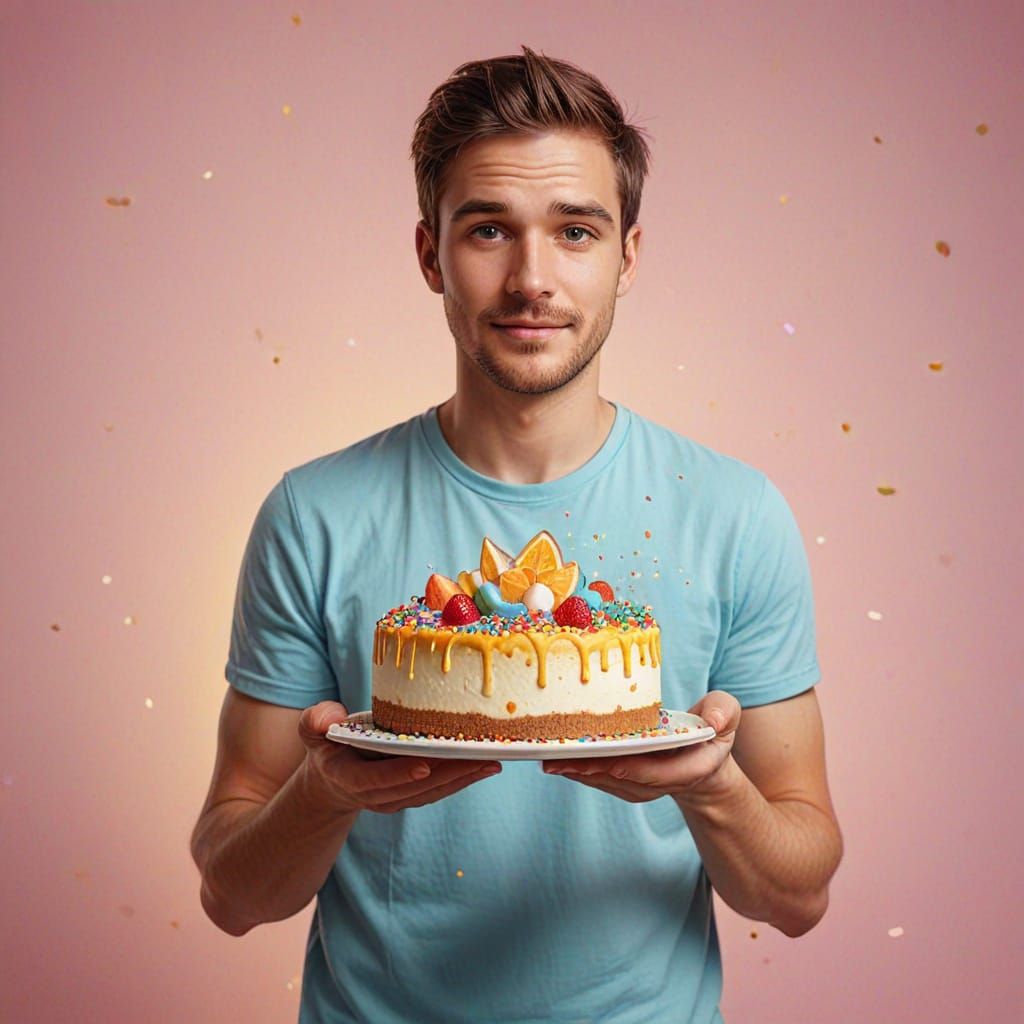 This digital painting features a person holding a cheesecake adorned with colorful sprinkles and bright decorations, set against a pastel background with warm lighting.