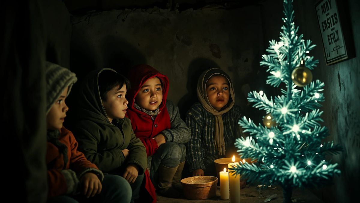 This image shows diverse children in a dark, humble shelter looking at a small, glowing Christmas tree. Cinematic lighting and film grain enhance the atmospheric scene.
