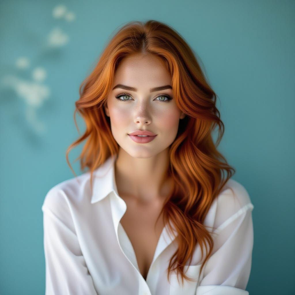 an elegantly beautiful sesxy young woman with vibrant red hair, wearing a loose white shirt. She gazes thoughtfully, surrounded by soft blue hues and subtle natural elements