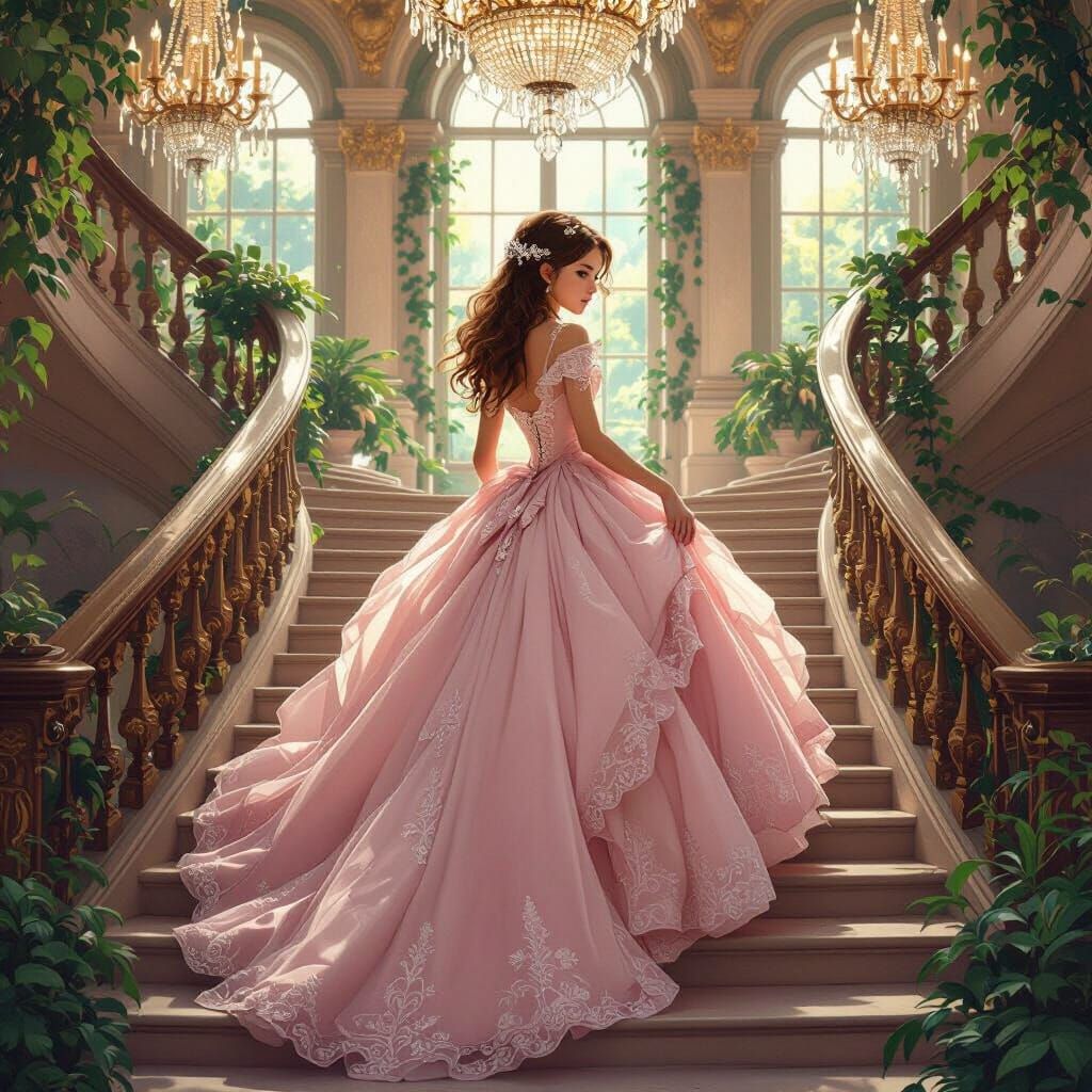 A digital painting of a girl in a pink ballgown walking down a palace staircase. The artwork evokes the flowing lines and decorative elements of art nouveau.