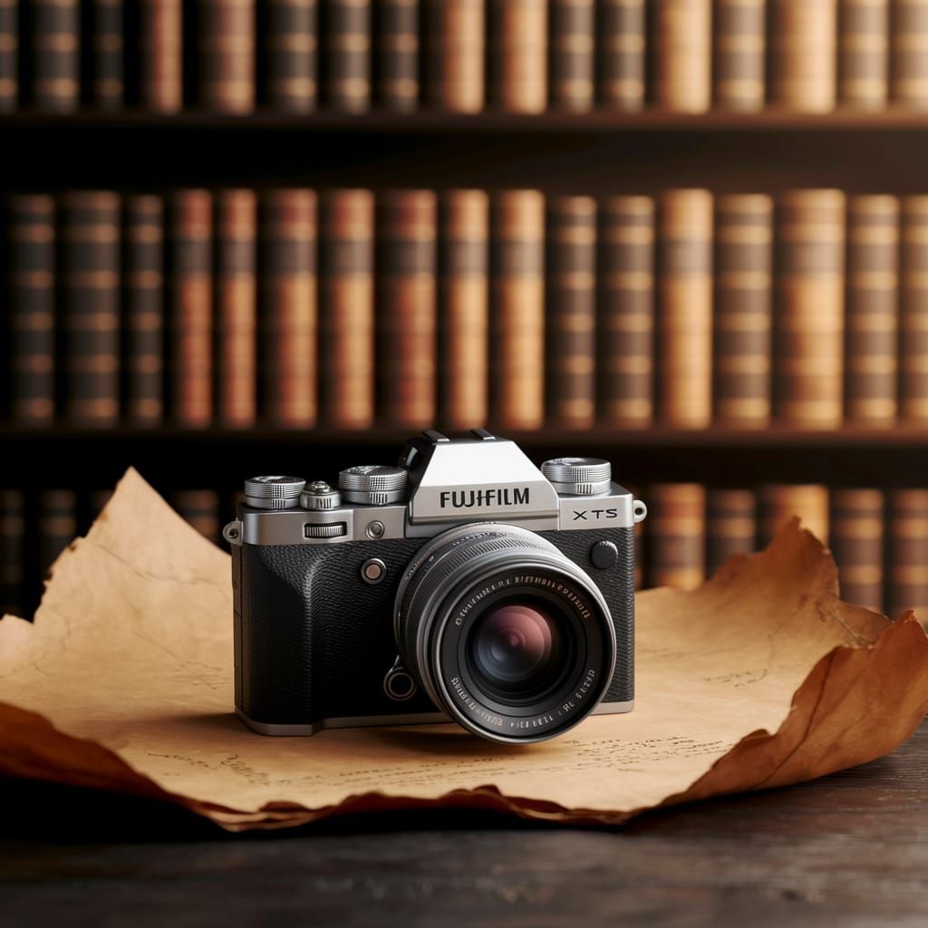 This image presents a Fujifilm X-T5 camera rendered as a detailed sketch on aged parchment, evoking the style of Leonardo da Vinci's anatomical studies with warm lighting and intricate details.