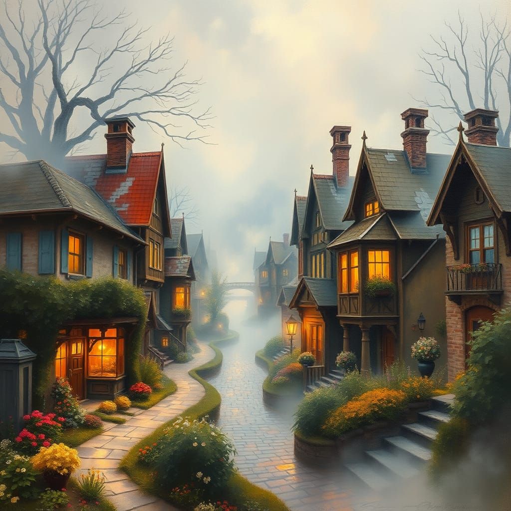 This captivating image is a masterful blend of Gouache and Watercolor styles, capturing a vintage town shrouded in ethereal mist with intricate details and textured brushstrokes, reminiscent of neo-impressionist and maximalist art.