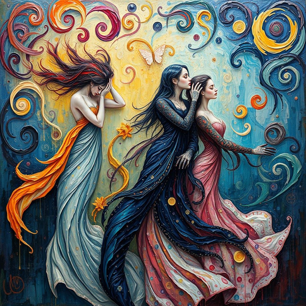 This image captures whispering figures in flowing attire amidst delicate, swirling patterns. Rendered with thick, colorful impasto acrylics and oil paints, it evokes a vibrant, dreamlike atmosphere.