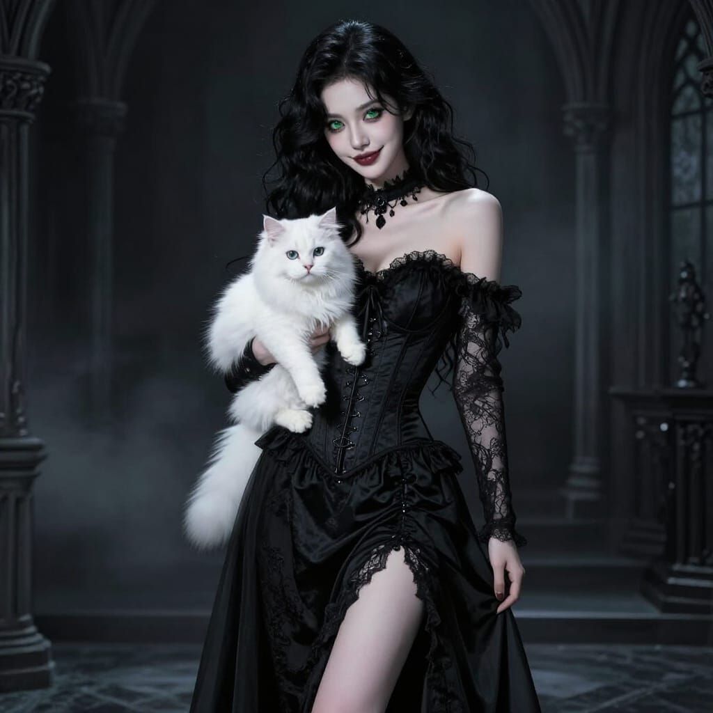 This image features a stunningly realistic portrait of a young woman in a detailed gothic corset dress, holding a fluffy white cat. The scene evokes mystery and seduction with dramatic, painterly lighting.