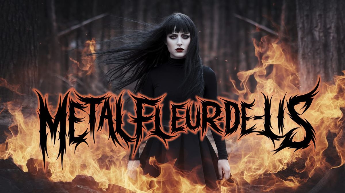 A striking picture of a metal fleur-de-lis design rendered in a heavy, spiky black metal font. It features a woman in a gothic black dress with black hair, in a black metal aesthetic.