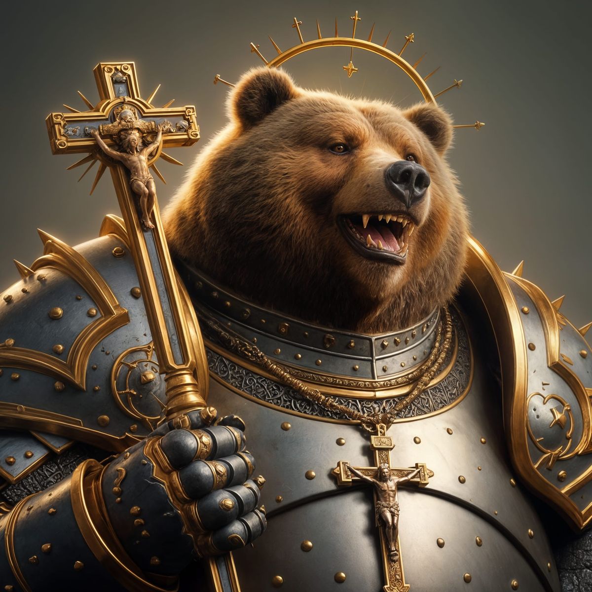 A striking picture of a giggling grizzly bear paladin. The bear wears shining holy armor and holds a crucifix, illuminated with dramatic rim and volumetric lighting.