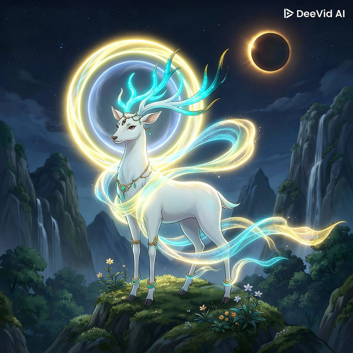 This image features a majestic deer with a radiant halo, as a light scarf flows towards it through the sky. The deer has a smooth, unpatterned coat on its belly and upper body.