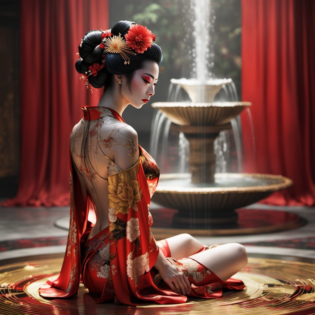 This image shows a geisha with floral and circuit patterns on her body. She is in a futuristic, elegant setting with red curtains and a water fountain, rendered in golds and reds.