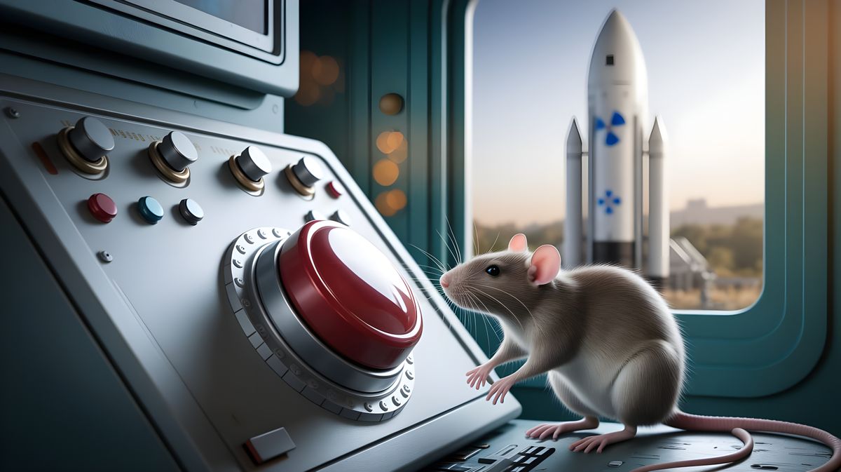 A derailed control panel with a giant red button stands out prominently. A detailed rat is perched nearby, its eyes fixated intently on the button. Through a window behind the panel, a large nuclear rocket is visible, poised for launch, adorned with an ionizing radiation symbol. The scene is captured ...