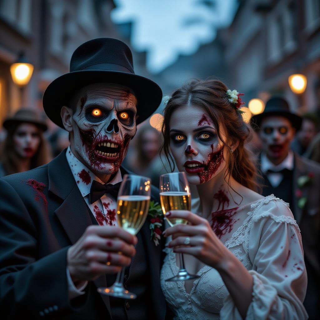 This image shows a full-body view of a realistic zombie couple clinking champagne glasses for the camera, set against a backdrop of many zombies.