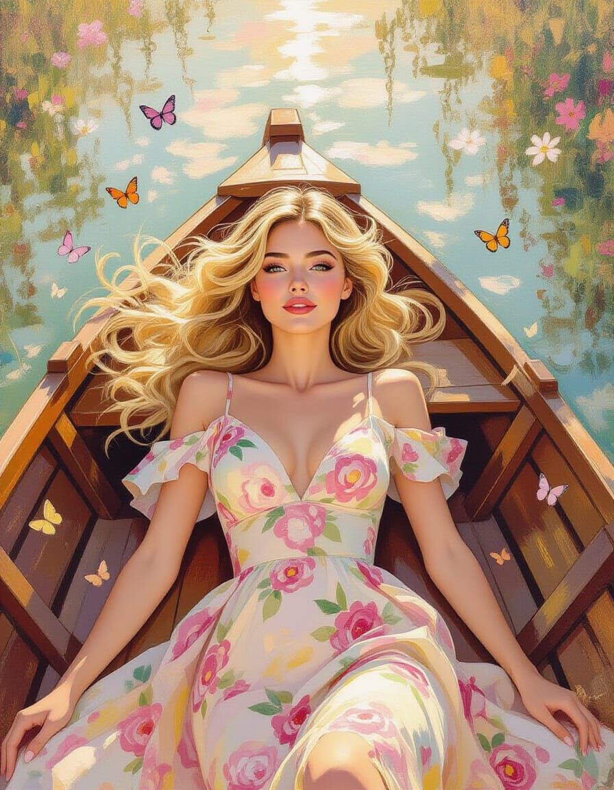 This image depicts a serene scene of a woman in a floral dress on a boat within a vibrant garden, rendered in an impressionistic oil painting style with visible brushstrokes and a warm, golden glow.