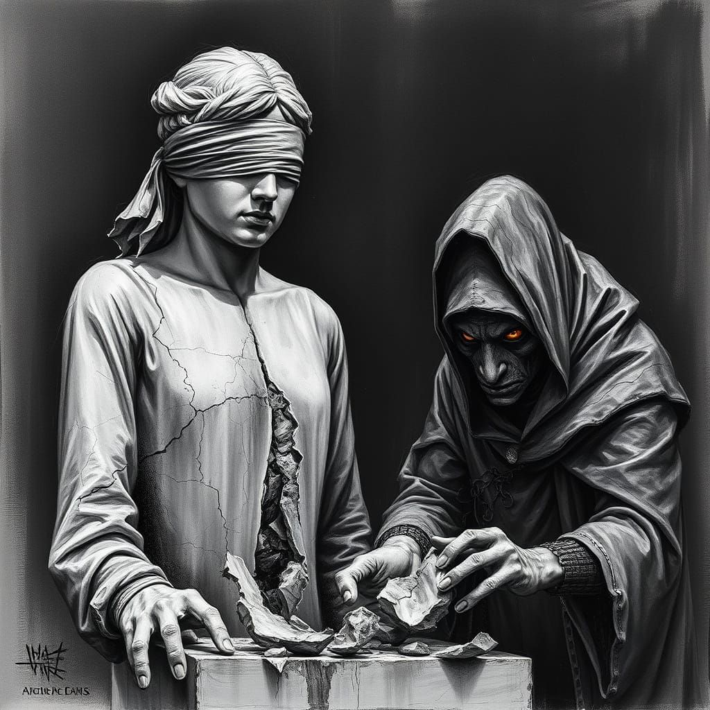 This image shows a marble statue of Fortune, blindfolded and cracking, beside a hyperdetailed figure of Bad Luck with sharp eyes. Rendered in a dramatic charcoal drawing style with deep contrasts and chiaroscuro lighting.