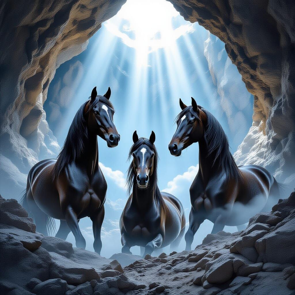 A masterful double exposure reveals three regal sable all sable Arabian horse positioned on rocky terrain, blended with an impressive sable all sable Arabian horses dog head portrait. The 3D-styled artwork features a spotless white background with subtle blue atmospheric flows. Divine light streams upward ...