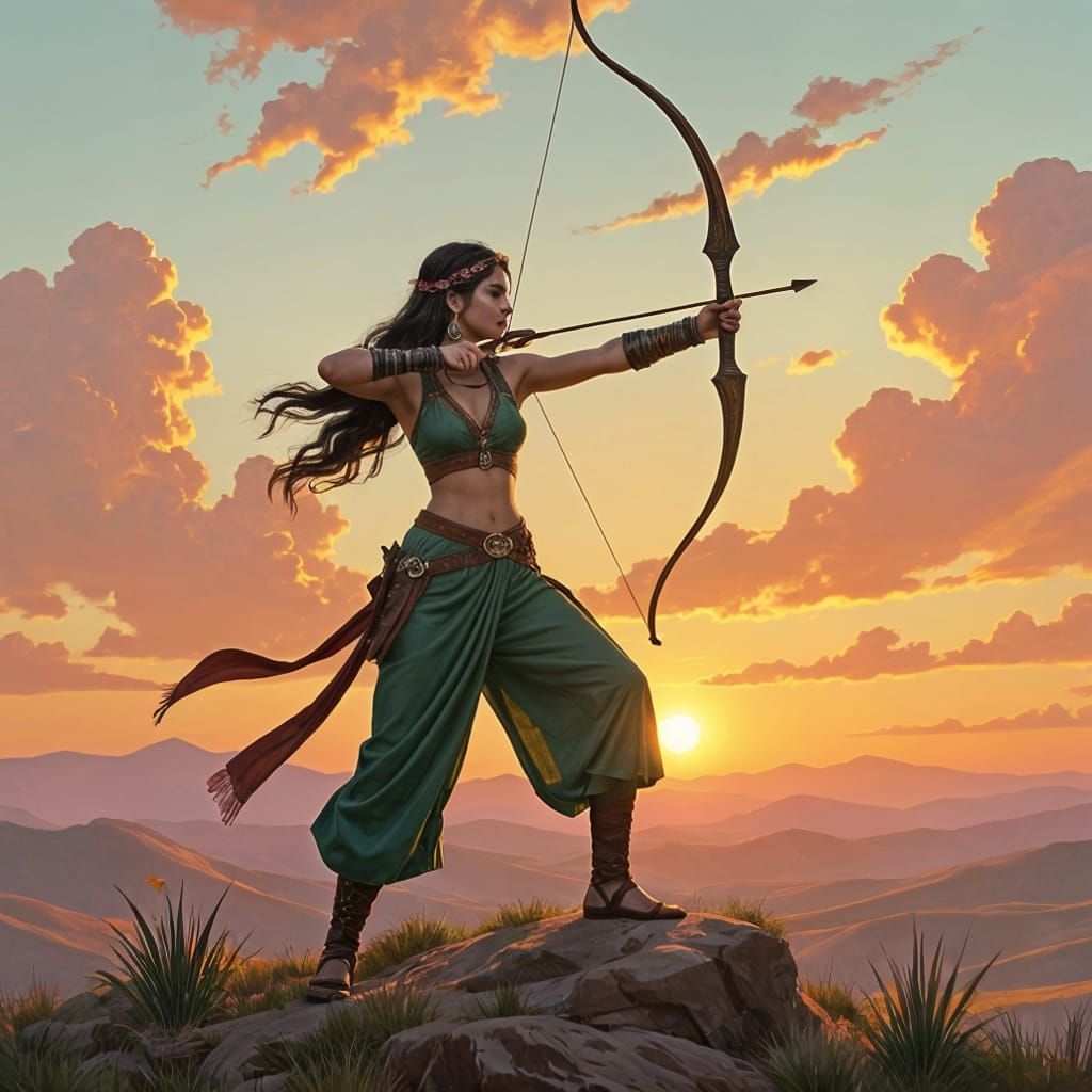 A striking picture of a woman warrior with a bow, standing on a hill. The artwork features vibrant warm colors and long shadows, rendered with intricate details and painterly textures in a fauvist style.