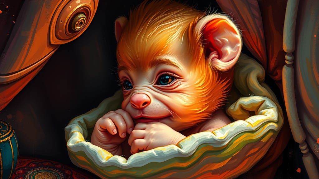 This dynamic painting captures a mischievous redheaded baby standing in their colorful bedroom, showcasing a playful expression, a tongue out, and a wink. The artwork blends expressive brushstrokes with intricate details, vibrant colors, and high-realism textures, creating a visually striking and immersi...