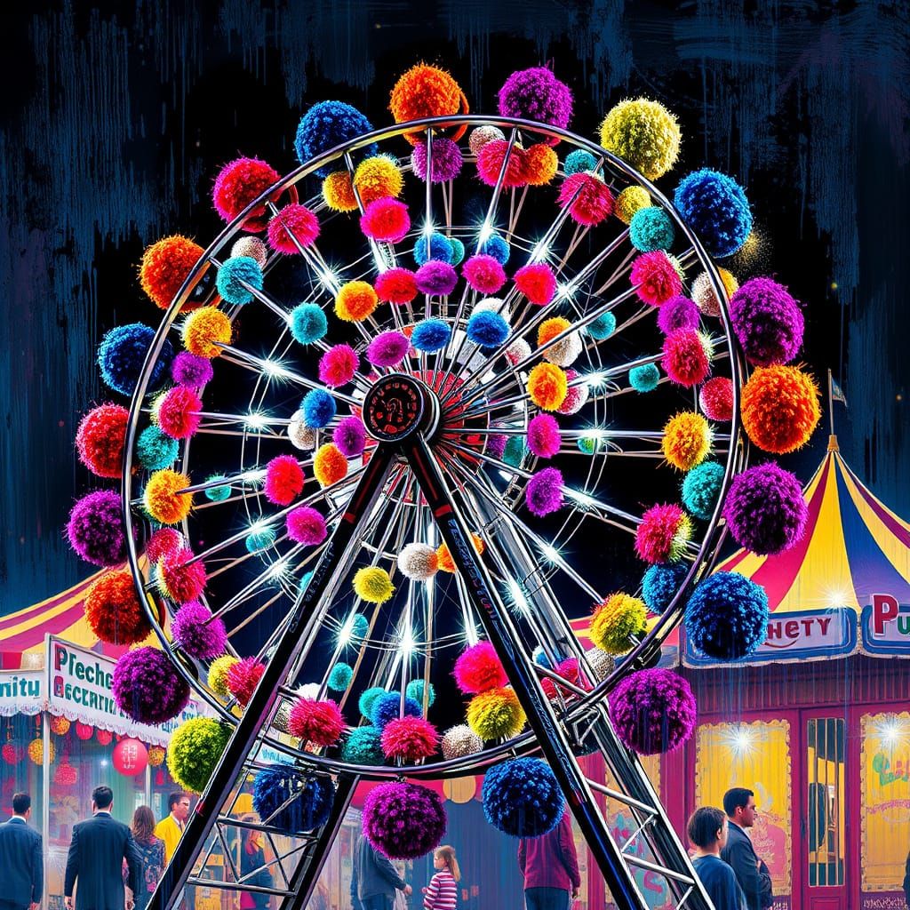 This image shows a whimsical Ferris wheel constructed from colorful pom poms, set against a vibrant carnival backdrop. The artwork features a graffiti art style with high contrast and ultra-detailed elements.
