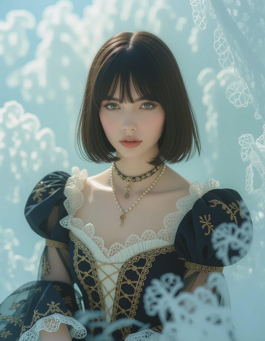 A striking picture of a model with blunt bangs in elegant dress. The model poses in a hyperdetailed, misty fantasy environment with soft, warm lighting and intricate textures. The aesthetic is reminiscent of whimsical fantasy paintings.