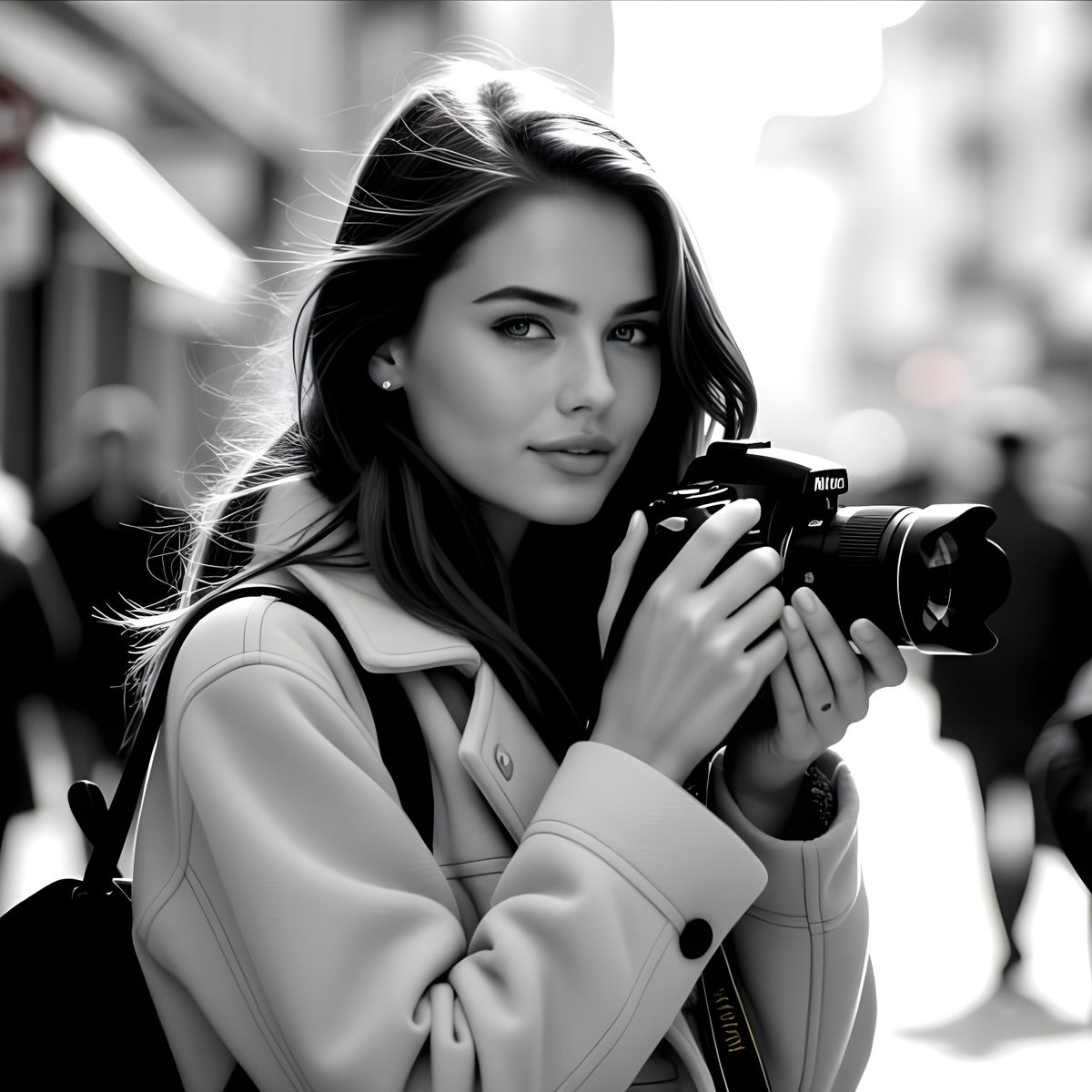 This black and white portrait captures a young photographer at work on a busy city street. The ambient light enhances the scene, highlighting fleeting expressions and hidden beauty.