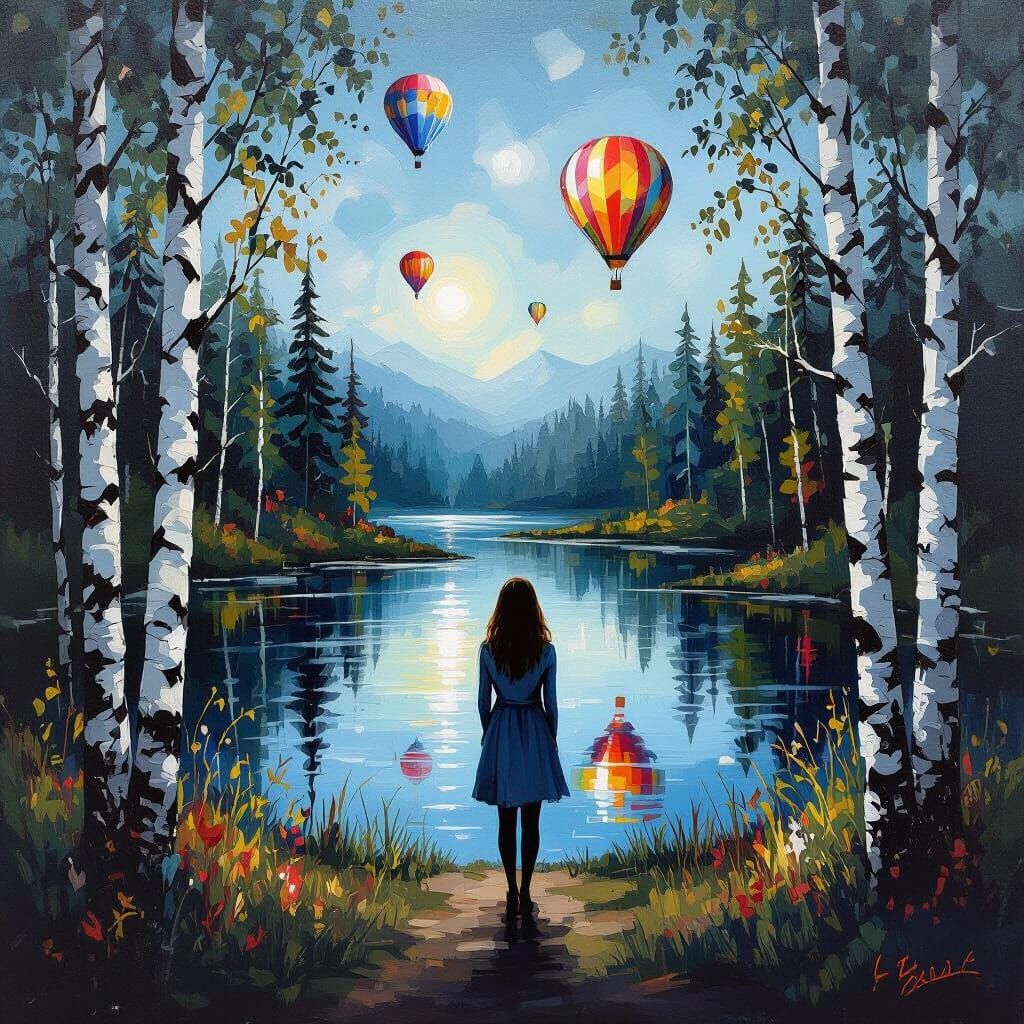 A woman stands in darkness encircled by birch trees, beside a reflective pond. Hot air balloons drift above, depicted as an expressive oil painting with bold strokes and vivid colors.